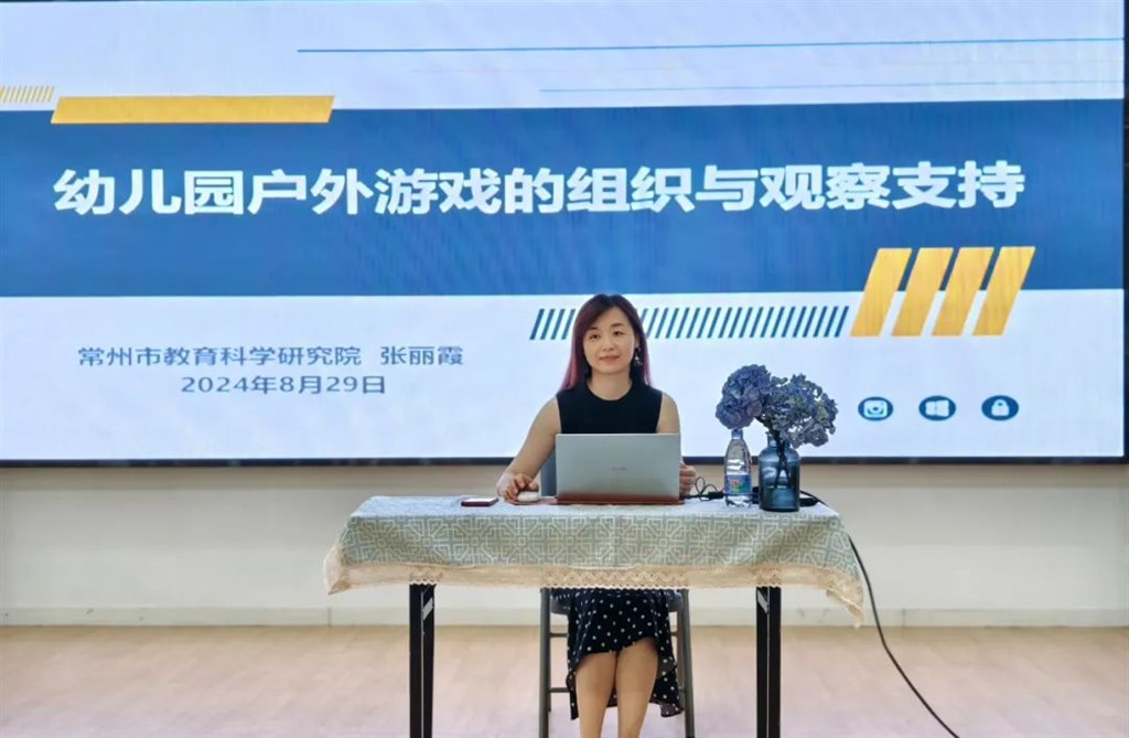 为贯彻落实暑假教师培训的相关文件精神,提升课程游戏化背景下教师专业能力,8月29日,我园有幸邀请到常州市教育科学研究院张丽霞老师,开展了户外专题培训,引领全体教师静心学习,充电赋能,不断通过学习提升自己,为新学期积蓄前行的力量。张老师首先从学习的本质的出发,分析幼儿园存在的户外游戏环境创设的误区,提出了幼儿园户外游戏理念要发生转变,从“教师中心”回归到“儿童立场”,从而促进儿童的主动学习。